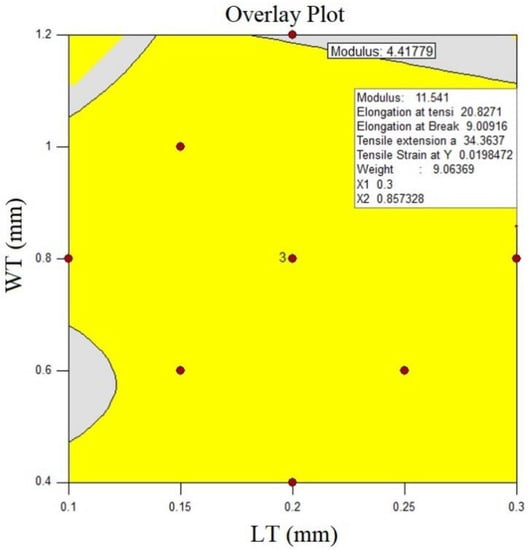 In this section, the optimization of 3D-printed PVA samples using the FFF method is addressed. In this optimization, two input parameters of the printer, namely WT and LT, were optimized based on the optimization Table 6, where the parameter ranges for both samples were evaluated, considering the upper and lower limits. Since the responses for this study are MTS and Weight, a goal was set for each in the optimization analysis, aiming to increase the MTS and decrease the Weight of the printed PVA samples. Furthermore, according to Table 7, three optimized samples were shown for this experiment, and the predicted values by the Design Expert software and the actual data from the tests were reported for these three optimized samples. As evident, the error values for the samples are below 15%, which is highly suitable for predicting the optimization of the samples based on previous studies, and conducted research. Additionally, considering the overlay plot in Figure 5, it demonstrates the optimized regions for the input parameters of the printer, where selecting a parameter within the yellow regions will result in optimal responses.