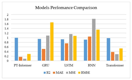 Figure 6 compares the PT-Informer model with the other current advanced prediction model for fault prediction. The y-axis of the turbine current represents the predictions of various models regarding the operational state of the steam turbine. The predicted value PT-informer is represented by red, the predicted value Gated Recurrent Unit(GRU) [36] is represented by brown, the predicted value Long Short-Term Memory(LSTM) [37] is represented by purple, the predicted value Recurrent Neural Network(RNN) is represented by gold, the predicted value Transformer is represented by Magenta color, and the actual value is represented by black. Table 1 and Figure 7 show the performance indicators of different model prediction results, including R2, MAE, MSE, and RMSE. R2 indicates the accuracy of the model fitting data and take a value in the range [0, 1]. The closer the value is to 1, the better the predictive performance of the model. MAE measures the average absolute difference between predicted and actual values, while MSE and RMSE consider squared differences, with RMSE being more interpretable due to sharing the same scale as the original data. The smaller the MAE, MSE, and RMSE indicators, the better the model performs. From the graph, it can be concluded that PT-Informer outperformed the other prediction model in each performance indicators. Specially, PT-Informer outperformed the traditional GRU with a 4.94% improvement in R2 performance for prediction.