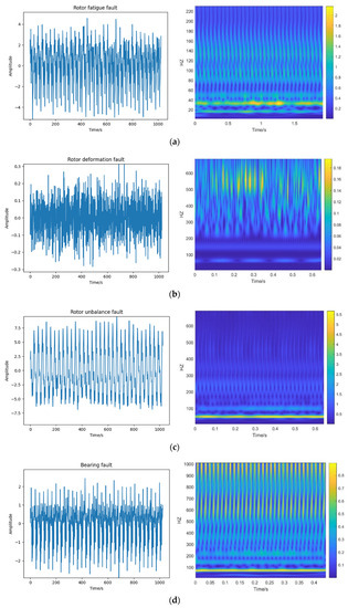 Figure 8a–e show the original vibration signals and time-frequency diagrams obtained through wavelet transform for different types of fault signals. The faults include rotor fatigue, rotor deformation, rotor unbalance, bearing faults, and oil seal leakage. Rotor fatigue refers to the gradual degradation of structural integrity due to repeated stress cycles. Rotor deformation refers to abnormal deviations from the intended rotor shape. Rotor unbalance occurs when the rotor’s mass distribution is uneven, leading to imbalance during rotation. Bearing faults encompass various issues within the rotor’s bearings. Oil seal leakage refers to the loss of sealing integrity, allowing lubricating oil to escape or contaminants to enter the system. Figure 8f displays the original vibration signals and time-frequency diagram obtained for normal signals. In the wavelet transform time-frequency diagram of normal signals, there is no significant energy signal in the low-frequency, intermediate-frequency, or high-frequency stages. Conversely, the wavelet-transform time-frequency diagrams of other fault signals show a more evident energy signal in the low-frequency, intermediate-frequency, or high-frequency bands. This observation suggests that the fault signal exhibits significant energy concentration or abnormal changes in specific frequency bands, which serves as a crucial basis and valuable clues for fault detection and diagnosis. Through meticulous analysis and comparison of the time-frequency diagrams associated with various fault types, it becomes possible to effectively distinguish and identify different fault modes, thereby providing essential guidance for subsequent fault prediction and diagnosis endeavors.