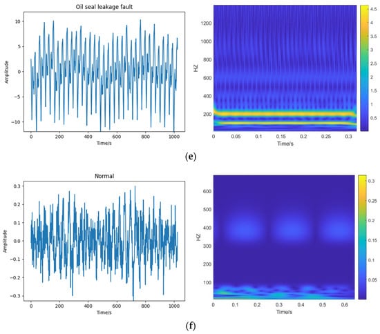 Wavelet transform time-frequency diagram of fault and normal state time series for: (a) rotor fatigue fault, (b) rotor deformation fault, (c) rotor unbalance fault, (d) bearing fault, (e) oil seal leakage fault, and (f) normal signals.