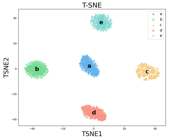 After performing feature extraction and dimensionality reduction using PCA and anomaly detection with T2 and Q test statistics, t-SNE [35] can be employed for data visualization and clustering in order to classify faults. As a non-linear dimensionality reduction technique, t-SNE projects high-dimensional data into a lower-dimensional space while preserving the relationships among data points as not is shown in Figure 4. This approach offers valuable insights into data distribution and patterns, which can help identify clusters or groups related to different fault types or operating conditions. By assigning labels to clustered data points, a fault classification model can be developed to automatically categorize new data based on similarity to labeled data.