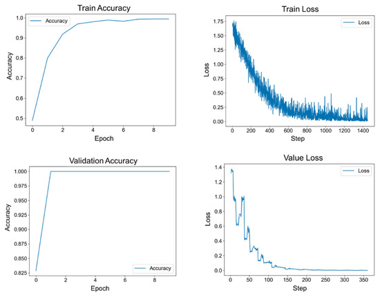 After the PT-Informer processing, the results can be fed into a neural network model for classification in fault detection. The neural network can automatically learn the complex nonlinear relationship between input features and fault types, by achieving high-precision fault detection. As shown in Figure 11, the accuracy of the training and validation sets both increased while the loss decreased, indicating the feasibility of this method.