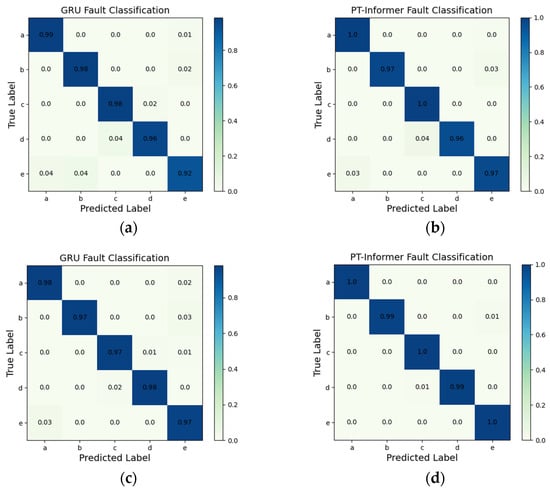 Fault classification results with GRU and PT-Informer: (a) SVC+GRU, (b) SVC+PT-Informer, (c) CNN+GRU, (d) CNN+PT-Informer.