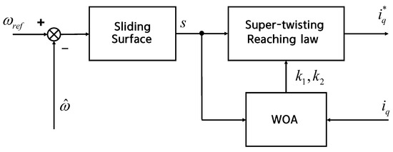 Among these methods, sliding mode control (SMC) has been considered as a solution with the advantages of quick response, simplicity, and high accuracy [8]. The SMC method is well known for its disturbance rejection and robustness [9]. However, the chattering phenomenon of the SMC originating from the switching gain is the main issue that limits its performance [10]. The large switching gain ensures the robustness of the SMC and can excite high-frequency dynamics [11]. Several methods have been developed to reduce chattering [12]. In [13], a high-order SMC was presented to eliminate the discontinuous term in the control input. In [14], backstepping control was designed to reduce chattering. The proposed filtered SMC, which provides a reconstructed signal, is an outstanding method [15]. For the sliding variable design, a disturbance estimator is applied to the sliding mode controller [16]. This study proposes an adaptive switching gain with super-twisting reaching law-based SMC using a whale optimization algorithm (WOA) [17]. The WOA is a metaheuristic algorithm that mimics the hunting behavior of humpback whales to obtain an optimal solution. Many metaheuristic algorithms have been applied for solving nonlinear and multimodal optimization problems due to their simple and flexible characteristics. Such algorithms including Crow Search Algorithm, Galactic Swarm Optimization, and Butterfly Optimization Algorithm are used in various industrial fields [18]. Compared to these algorithms, WOA is easier to implement and more flexible. Moreover, the WOA is gradient-free and insensitive to the initial solutions [19]. With the advantage of a quick and effective response, the WOA is used to optimize the switching gain of the SMC according to the speed error. However, these controllers require information about the rotor speed and position. Position sensors reduce the reliability of a system and increase costs [20]. The malfunction of the sensors may limit the PMSM controller’s operation. Therefore, the reduction of sensor dependence is necessary for reliability enhancement [21]. Therefore, sensorless control is important in PMSMs. Sensorless control algorithms include model reference adaptive control [22], back electromotive force [23], a state observer such as the adaptive interconnected observer [24], and a sliding mode observer [25]. The sensorless control methods have been developed to be suitable in wide-ranging speeds and robust to load variations.