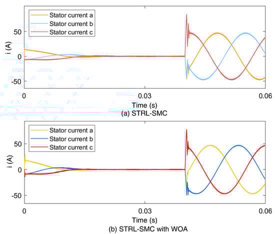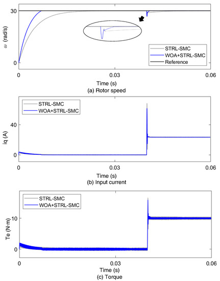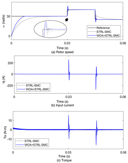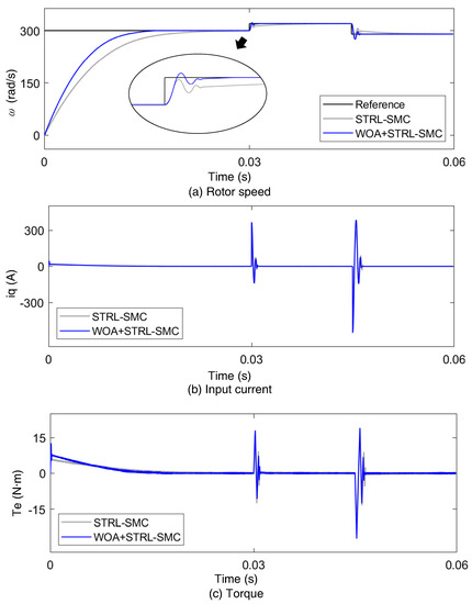 The STRL-SMC and STRL-SMC with the WOA were compared in detail to verify the effectiveness of the proposed control methods. Figure 4 shows the results for STRL-SMC and STRL-SMC with the WOA. The reference speed was set to 300 rad/s. The rated speed and power for the PMSM used in simulation are 3000 rpm and 1.1 kW, respectively. The simulation result was made with a sampling time of 1 s, and the same sampling time was applied to both the current control loop and the speed control loop. The electrical and mechanical time constant in PMSM are = 4.64 ms and = 9.36 ms, respectively.