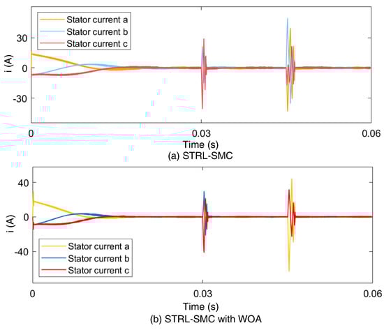 The parameters of WOA are given in Table 2. Figure 4 shows the case where the load torque was suddenly increased by 20 N·m at 0.04 s. For STRL-SMC with WOA, the system dynamics shows the reduced convergence time and the chattering in steady state becomes smaller than STRL-SMC about 60%, as shown in Figure 4. In Table 3, the switching gains for STRL-SMC and STRL-SMC with WOA are presented. The switching gains of the STRL-SMC without WOA were chosen for the best performance. The gain in Equation (7) was set to 1000. The values of and are randomly initialized in the range of parameters listed in Table 3. The variation range of and during optimization is indicated in Table 2. In STRL-SMC with the WOA, the system dynamics were faster and the chattering became smaller than those STRL-SMC, as shown in Figure 4. In Figure 4, the STRL-SMC without WOA takes 0.0382 s to reach the reference speed and 0.0148 s to recover speed after an external load is added at 0.04 s. For the STRL-SMC using WOA, the settling time is 0.0163 s. The STRL-SMC with WOA recovers the speed at 0.0420 s, which is 0.0128 s faster than STRL-SMC without the WOA. It is represented that the performance of STRL-SMC with WOA is more robust than STRL-SMC. Compared to STRL-SMC, the controller using WOA reduces speed tracking error in shorter time when the external load is added. The change of switching gains optimized by WOA are shown in Table 4. The gains increased at 0.045 s with added external load. The speed response of the PMSM speed-tracking system is shown in Figure 4. Figure 5 shows the 3-phase current waveform under the same condition in Figure 4.