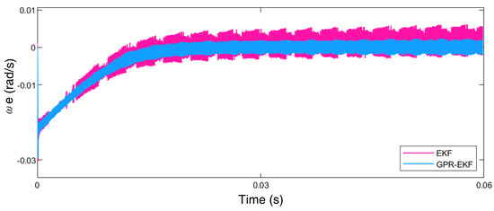 In Figure 6, the controller of STRL-SMC with WOA provides better tracking performance than the controller without WOA. The controller can track the reference speed with fast response and small error by using the WOA. In Figure 6, the settling time of STRL-SMC without WOA is 0.03 s while the proposed controller using WOA takes 0.0163 s. After the reference speed change at 0.03 s, the STRL-SMC without WOA tracks the speed at 0.0449 s. The settling time for the speed recovery of the controller without WOA is 0.0591 s after reference speed change at 0.045 s. The STRL-SMC using WOA takes 0.0005 s and 0.0014 s for speed recovery after the reference speed change at 0.03 s and 0.045 s, respectively. From Figure 7, it is represented that the three-phase current wave form is related to the reference speed change shown in Figure 6. The controller using the WOA proved the effectiveness in chattering reduction and dynamic performance. Figure 8 shows the PMSM speed tracking under an additional external load of 10 N·m at 0.04 s for a low speed of 30 rad/s. In Figure 9, the reference speed increases from 30 rad/s to 40 rad/s at 0.03 s. Moreover, at 0.045 s, the reference speed changes to 25 rad/s. Figure 10 presents the error in the estimated speed from the EKF and the measured speed. Figure 10 shows that the estimated speed from the GPR-EKF exhibits fewer oscillations than the EKF only. The error in the rotor angle between the EKF estimation and measurement is shown in Figure 11. It is observed that the GPR-EKF has less error than the EKF only. With the covariance matrix tuning of the GPR, the EKF algorithm can track the rotor speed with accuracy and robustness.