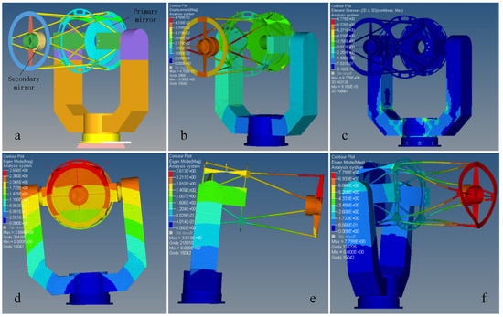 (a) The finite element model of the original structure; (b) the static deformation of the telescope; (c) the static stress of the telescope; (d) the first vibration mode of the telescope; (e) the second vibration mode of the telescope; and (f) the third vibration mode of the telescope.