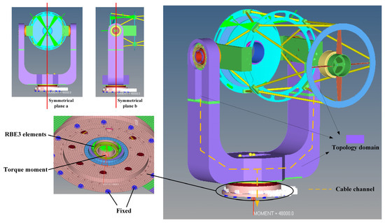 Unlike the approach taken in the literature [10], this study constructs a finite element model of the entire telescope, with a focus on optimizing the U-frame. This approach allowed us to accurately represent the actual connection scenario when the U-frame is in use, resulting in optimization outcomes that hold more practical significance. As depicted in Figure 3, we applied a fixed constraint of six degrees of freedom to the 12 tapped holes at the bottom. The torque from the azimuthal motor was evenly distributed to the azimuthal axis through the RBE3 element. Additionally, we implemented a symmetrical constraint in two vertical planes to ensure the balance of the support structure. This constraint greatly simplified the operation of the structure, process, and control system. Furthermore, a hollow channel was incorporated for cabling purposes.