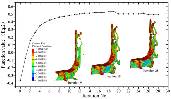 The convergence curve of the objective function in topology optimization is presented in Figure 4. It was observed that as the optimization progressed, the force transmission path became more evident and ultimately converged at the 28th iteration. The topology result only displays 1/4 of the structure due to the imposed symmetry constraint.