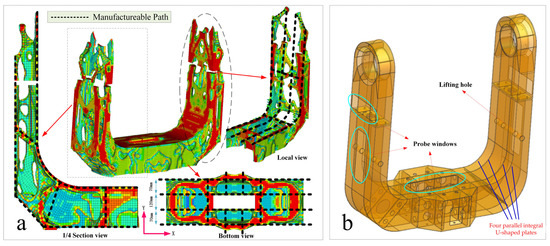 Figure 5a presents a more detailed topological result, illustrating the force transmission paths in each direction. The diagram reveals that the X-direction comprises four parallel integral U-shaped plates, spaced at distances of 70 mm, 120 mm, and 70 mm, respectively. These plates form the fundamental structure of the U-frame discussed in this paper. The remaining structure is distributed among the four U-shaped plates based on the other topological findings. Figure 5b showcases the reconstructed structure derived from the topology results. The left- and right-side loads were directly connected to the unwelded or uncast cutting U-shaped plates, which possessed high stiffness, thereby ensuring a high level of overall structural integrity. Additionally, the reconstructed structure incorporated lifting and probing windows to facilitate lifting and wiring, provided that the stiffness and strength requirements were met.
