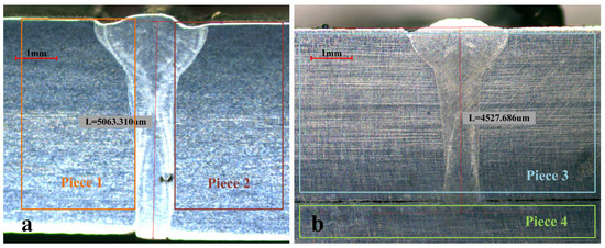 (a) Weld metallographic diagrams of the first type of 304 joints; and (b) weld metallographic diagrams of the first type of 304 joints.