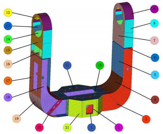 Based on the topology optimization and reconstructed structure, we developed a parametric model of the U-frame using shell elements. The shell elements were categorized into 21 types of plates, as depicted in Figure 7. The classification of these plates took into account the two-plane symmetry constraint, as illustrated in Figure 2.
