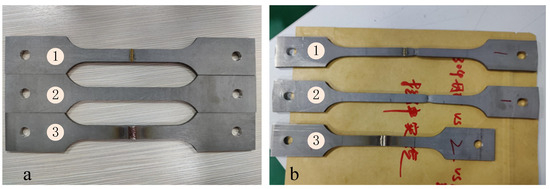 The experimental material consisted of 4 mm thick laser-cut 304 plates. Figure 8a shows a group of welded specimens, where No. 1 represents laser-welded specimens, No. 2 represents the pure cut base material, and No. 3 represents argon-arc-welded specimens. The initial length after welding was approximately the same for all three specimens. Subsequently, a 10 T tensile tester was used to fracture the three specimens. The fractured specimens are depicted in Figure 8b. It is evident that the laser-welded specimens fractured from the base material rather than from the joint, indicating that the strength of the laser-welded joint surpasses that of the base material. The specimens welded using the argon arc technique fractured at the joint, suggesting that the strength of the argon-arc-welded joint is lower than that of the base material and also lower than that of laser welding. Furthermore, the temperature of the joint was measured immediately after welding using a temperature measuring gun. It was found that the joint temperature reached up to 250 °C for TIG welding, whereas for laser welding, it was only about 40 °C. This indicates that laser welding releases less heat, leading to the reasonable assumption that its residual thermal stress is also lower.