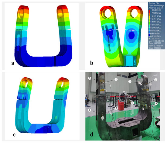To validate the effectiveness of the optimized method and laser welding process, we conducted a free vibration experiment on the prototype. Initially, a free modal finite element analysis was performed, and the results are depicted in Figure 10a–c. These figures illustrate that the first three natural frequencies of the non-rigid body were 77.58 HZ, 126.70 HZ, and 134.63 HZ, respectively. Subsequently, the actual sensor insertion position and power hammer striking position were determined based on the vibration diagram of the first three orders, as shown in Figure 10d.