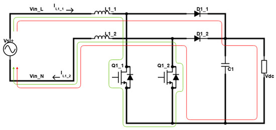 The detailed operation of the bridgeless interleaved buck-boost converter is performed in two different cycles of the input voltage, i.e., the positive and the negative half cycle, as indicated by two different colors in Figure 3. During the positive half cycle of the input supply source, the power is transmitted from the input to the output with the help of L1_1. The switch Q1_1 is ON, and the current path is provided between the load and the input supply source via inductor L1_1. Similarly, for a negative half cycle, the power is supplied through L1_2. The circuit L1_1, Q1_1, and D1_1 act as a single boost converter, switching at a high frequency for the first positive cycle, as indicated by the blue line in Figure 3. For the negative half cycle, a link is provided between the input supply source and the output load with the help of inductor L1_2, as indicated by the red line in Figure 3. Here L1_2, Q1_2, and D1_2 behave as a single boost converter, switching at high frequency for the other cycle. The voltages Vin_L and Vin_N represent the line and the neutral voltages.