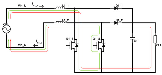 Currents that flow in the circuit without contributing to the load current are called circulating currents. Several circulating current loops exist in the bridgeless interleaved topology scheme presented in the previous section. These loops are discussed in detail in this section of the article. The source voltage Vs is in sinusoidal form, so we consider the operation of the converter according to the two different cycles of the grid voltage, i.e., (1) Vs > 0 and (2) Vs < 0. For the power factor correction and output voltage regulations, the circuits’ working, circulating current loops, and inductor current statuses are discussed below in detail for cases (1) and (2).