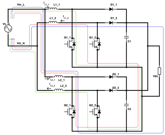 Power Flow in the interleaved boost converter circuit (a positive half-cycle is indicated by the blue color, and a negative half-cycle is indicated by the red color).