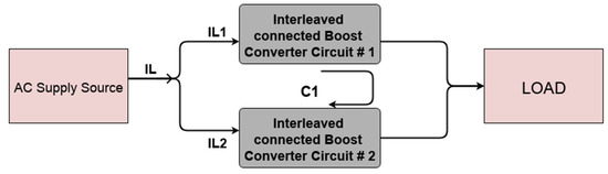 For power factor compensation, a block diagram in Figure 3 is presented, which contains the bridgeless PFC with the interleaved topology of boost converters. An input EMI filter and inrush control relay are placed between the input supply source and the PFC converter, while a capacitor filter and a load are at the outer end of the circuit. Two boost converters are connected in an interleaved scheme for each half-line cycle. The circuit’s input voltage is symmetrical in two half-line cycles, while the line current of the circuit flows only through the two diodes of the circuit, which results in low conduction losses. The space utilization and the thermal performance of the circuit improve due to the use of two inductors compared to a single conventional inductor. It can help to improve the system’s efficiency, even for higher power applications. The sum of both inductor currents, i.e., IL1_1 and IL1_2, represents the total current from the input supply source. The ripple currents will be out of phase in these inductors; therefore, they will cancel the effect of each other. This will reduce the EMI filter size by mitigating the high-frequency ripple current generated due to the high-speed switching of the boost converter. The outer capacitor’s high-frequency ripple is also reduced in this scheme.