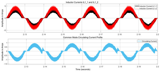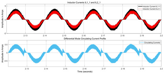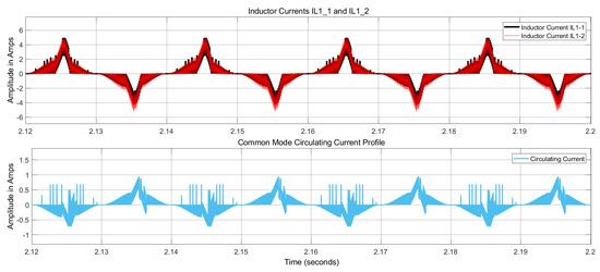 Depending upon the topologies followed in Figure 8, there are two main types of circulating currents inside proposed modules: the Common Mode (CMCCs) and Differential Mode Circulating Currents (DMCCs). Suppose the converter module for a single setup is considered, where the converters are connected in an interleaved topology. In this case, there is a CMCC, and if two modules of such interleaved converters are connected in parallel then the circulating current will be CMCC along with DMCC.