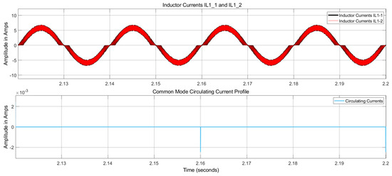 Next, the full proposed controller system, incorporating both CMCC and DMCC controllers, is introduced. Figure 17 presents the circulating current profile in a single interleaved topology module, i.e., the CMCC profile, while Figure 18 represents the circulating current profile of the two parallel-connected modules, i.e., the DMCC profile, alongside their respective inductor currents. The results demonstrate that our proposed control scheme exerts proper control over CMCCs and DMCCs, effectively reducing them from the system. Figure 19 illustrates the input supply voltage and current profiles, which are purely sinusoidal and perfectly in phase.