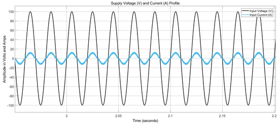 The CMCC profile for the fully applied proposed controller is given in Figure 31, which shows that both legs of the single TI boards were equal in phase and amplitude and reduced the circulating currents inside a single board. The DMCC profile given in Figure 32 shows that having nearly the same currents in the first leg of each TI board results in reduced circulating currents between the parallel-connected boards. This proposed controller will nearly provide a unity power factor of the system, as both the input supply voltage and the currents are in phase (Figure 33).