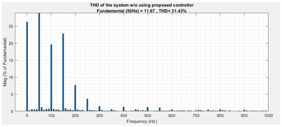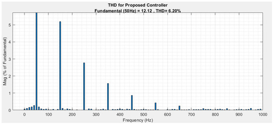 To further evaluate the effectiveness of the proposed control scheme, a THD analysis is conducted for this case study. Figure 20 displays the THD profile with the proposed controller, showcasing a lower THD and better harmonics elimination compared to Figure 21, where the THD profile is without the proposed controller.