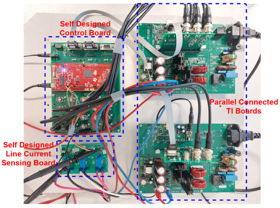 A prototype shown in Figure 22 was constructed to validate our proposed control scheme. Two separate TI boards with Piccolo C2000 (TMS320F28035 microcontroller MCU) controllers were utilized for the experiments. The generic model of this prototype of the TI board is consistent with the one considered for our simulations, as depicted in Figure 6. These boards are equipped with boost converters for Power Factor Correction (PFC) purposes, with each panel containing two boost converters connected in the interleaved scheme. The block diagram of the complete power system along with control board are depicted in Figure 23.