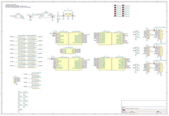 Two PFC boards from Texas Instruments (TMDSHVBLPFCKIT) were connected to a common control board via an interface with the PCBs which fit in the connector in which the original microcontroller used to be mounted. These interface PCBs fed the analog signals (inductor currents, line voltages, and DC bus voltage) to the control board via coaxial cables. This control board routed the signals to the ADC pins of the LAUNCHXL-F28379D microcontroller. After executing the control algorithm, the PWM signals were generated and sent to the PFCs. The schematic diagram and PCB layout of the control board and interface boards are shown in Figure 24 and Figure 25, respectively.