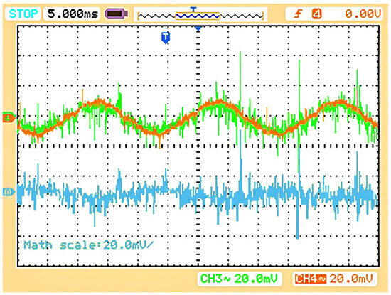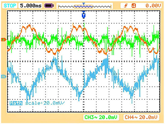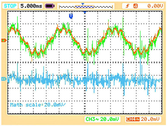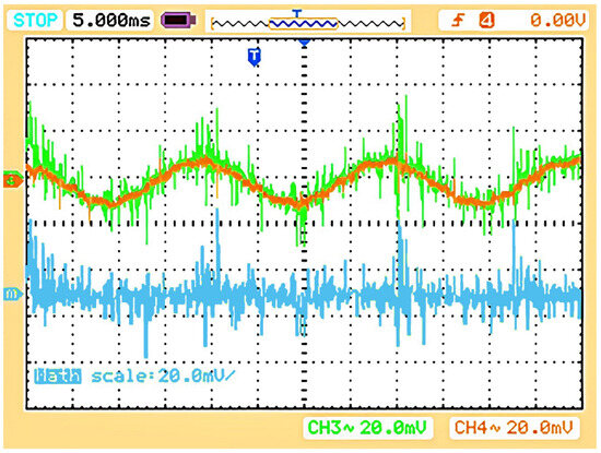 The experimental setup was conducted in multiple stages. Initially, the CMCC and DMCC were monitored using the default TI control of these boards, which is based on the input voltage feed-forward control. Subsequently, our proposed controller was introduced into the experiments without applying the CMCC and DMCC controllers. Finally, the complete proposed controller was implemented, encompassing CMCC and DMCC controllers. The experimental results from Figure 26, Figure 27, Figure 28, Figure 29, Figure 30, Figure 31, Figure 32 and Figure 33 were compared to demonstrate the differences and validate the effectiveness of our proposed control scheme.