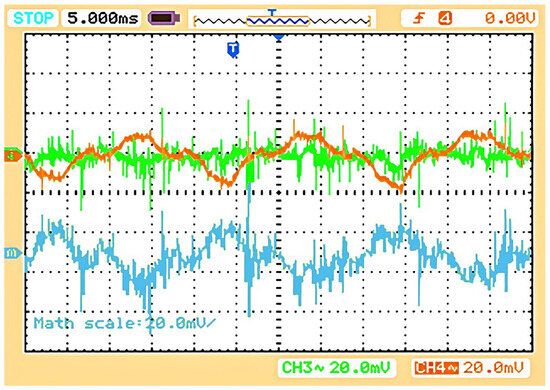 For TI default control, the experimental results are shown in Figure 26, Figure 27 and Figure 28. Figure 26 shows the CMCC profile. It can be seen that both the line currents (the first and second leg of first TI board) are in phase and have the same amplitude. Still, distortion occurred in their shape, affecting the system’s power factor (Figure 28). The DMCC profile (first line current of both parallel-connected TI boards) for the TI boards is shown in Figure 27. The difference in the shape of each line current resulted in influential circulating currents from one board to another.