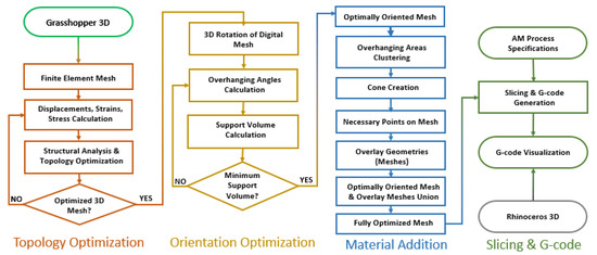 In this work, a process that optimizes the design of a given component to enhance its manufacturability for a specific AM procedure was presented. This workflow, in order to be accomplished, consists of certain steps which are the topology optimization, the orientation optimization, the material addition, and, to complete this process, a step that slices and generates machine code is also added. The results of this workflow regarding the mesh and the support structures’ volume, as long as the estimated build time is compared to that of a conventional workflow, where the design engineer optimizes the component manually, are given as the outcome of a structural analysis. For the specific case study examined in the manuscript, a total volume and build time reduction of around 80% and 50% is observed, respectively, compared with a conventional workflow.