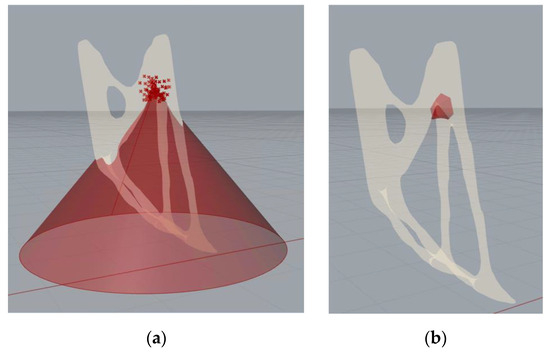 The next step in the proposed method aims to cover all the remaining overhanging areas with additional material to reduce or even eliminate the need for support structures in the manufacturing process. The general idea behind the material addition procedure is based on creating a geometry that complies with the manufacturing limitations of the AM process. The basic geometrical shape that its entire surface maintains a constant angle throughout its height is a cone. Therefore, the desired overlay geometry occurs from the Boolean difference in a conical surface that has a θ-degree normal vector (where θ is the limit imposed by the AM process) with a geometry that has been created from a set of points that define the border around the problematic overhanging area. After creating the conical surface, the next step of the procedure is to find the necessary points of the part to project on the aforementioned conical surface in order to create a new geometry that will cover the overhanging areas. At first, the points of the cluster are used to find their closest points on the conical surface. Then, these points (of the conical surface) are used to find a certain number of corresponding points of the initial mesh, and these, in turn, are used to locate more points on the conical surface (Figure 2a). It has to be noted that all the overlay geometries are separate meshes and are joined into a single mesh for the next step (Figure 2b).