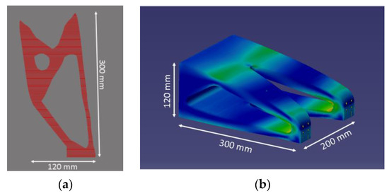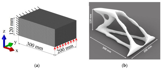 In order to validate the proposed method, a case study of a simple cantilever beam was examined. The beam has initial dimensions of 300 × 200 × 120 (mm) for its length (x-axis), width (y-axis), and height (z-axis), respectively. A fixed constraint is applied in its left side, whereas a uniformly distributed linear load is applied throughout the y-axis, in an upward direction, in the lower right edge of the structure with a value of 200 N/m. (Figure 3a). The material is assumed to be 316L stainless steel with Young’s Modulus E = 210 GPa and Poisson’s Ratio ν = 0.3 [45]. It is worth mentioning that the properties used for the case study have been obtained from the literature and correspond to test coupons that were experimentally characterized using the same DED machine and material the authors intended to use [46]. These correspond to the properties directly obtained by the DED process without any post-processing, as this can often be the case for DED end users (contrary to the common practice of post processing in PBF processes). Since properties are dependent on the direction (and are typically lower across the deposition direction), the authors elected to use the worst scenario due to the orientation variation that characterizes the proposed method. The final material properties used are summarized in Table 2.