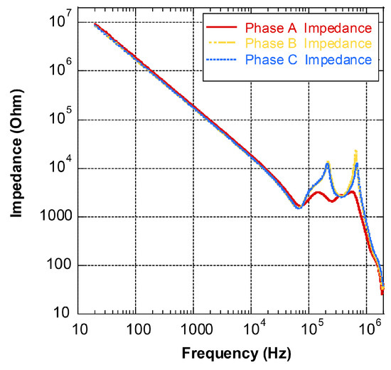The offline testing technique, sweep frequency response analysis (SFRA), has been successful in transformer winding mechanical condition evaluation [16]. However, its application for motor diagnosis is rarely seen in practice. Figure 1 shows an example of SFRA testing results on a motor. The inductive property dominates most of the measurement frequency range. Extending the upper-frequency limit is required for winding deformation assessment. However, it is not feasible as the measuring technique in the radio frequency range is fundamentally different. Vibration and motor current signature analysis (MCSA) are two widespread mechanical condition monitoring techniques [17]. However, the machine design, sensor installation, and operating conditions (e.g., motor slip) also have a significant impact on the measurement results [18,19]. False indications, low sensitivity, and difficulty in fault interpretation are often encountered.