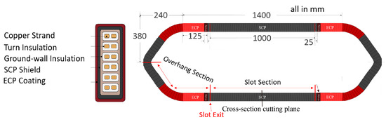 The structure of the stator winding coil rated at 6.6 kV is shown in Figure 2. There are six turns in total, and each turn consists of two copper strands. The overall length consists of two sections, the straight and overhang (end-winding) sections. Covering half of the coil, the straight section (wrapped by ECP and SCP) has a length of 1.4 m. The two overhang sections beside it amount to 1.0 m. The total coil length is 28.8 m, and the straight section length adds up to 16.8 m.