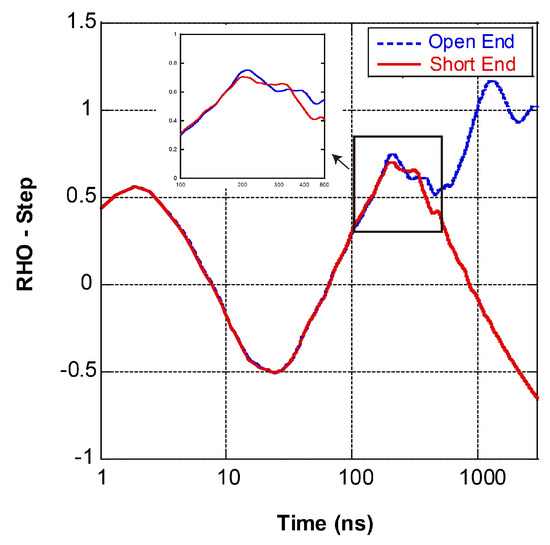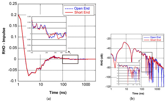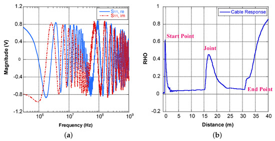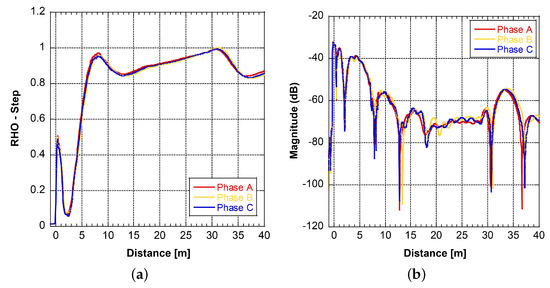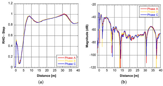 The time and magnitude are obtained after the transformation of the frequency domain data. Multiplying the time by half of the propagation speed changes the time into distance. The relationship between the magnitude (RHO) and wave impedance can be expressed by Equation (11). The reflection is equal to when the test terminal is open (infinite impedance), when the test terminal is short (zero impedance), and 0 if the test object impedance perfectly matches the instrument and its test leads ().