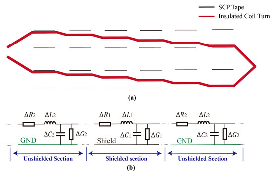 In the RF frequency range, the wavelength of the injected signal is comparable with or shorter than the physical size of the test object. Thus, the transmission line model with distributed circuit elements has to be used for results analysis. The transmission line model of the winding coil is illustrated in Figure 5. Each section of four elements , , , and represents an infinitesimally short length of the shielded or unshielded section, which is then cascaded to the actual length. The circuit elements of the shielded and unshielded sections are different. This leads to the periodic change of the wave propagation mode along the coil.