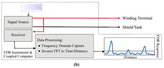 The FDR measurement is based on the vector network analyzer (VNA) technology. The instrument injects a series of sinusoidal voltages in a broad frequency range into the test object. The scattering parameter is measured, which is defined as the ratio of the reflected voltage and incident voltage. Then, the data in the frequency domain are transformed into the time domain to form a TDR-like display, as shown in Figure 4. The transformation can be achieved by the fast Fourier transformation (FFT) or chirp–Z algorithm [25,26]. Some commercial VNAs (e.g., Keysight M9800A) are integrated with the time domain analysis function, which performs the transformation automatically after the data are obtained. The TDR-like display provides a more intuitive representation of the discontinuities in the test object. The distance is calculated by multiplying the time (x-axis after transformation) by half of the wave propagation speed. The FDR resolution and range are given by the following equations [27]:
