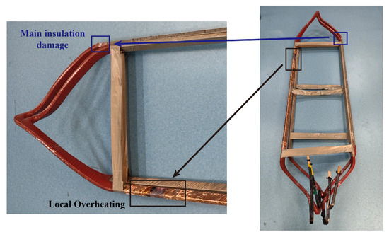 The end-winding discharge usually happens at the core exit area due to the ECP problem. The spot adjacent to the shield (2.4 m from the near end terminal) was selected as the discharge location. The insulation coating of the first turn was scratched to simulate the fault. For the short turn-to-turn fault, the spot below the damaged insulation of the first turn was selected. Overheating is more likely to happen within the slot, so the spot 3.5 m from the near end terminal was selected, as shown in Figure 8. A low resistive path from the conductor to the shield was created for the end-winding discharge and tracking between coil faults. For the shorted turn-to-turn fault, two adjacent coil turns were connected by a thin wire.