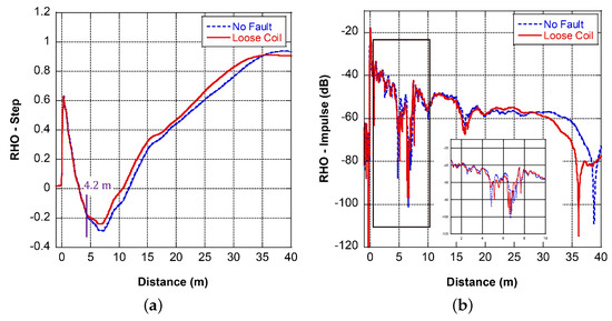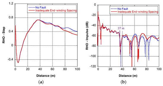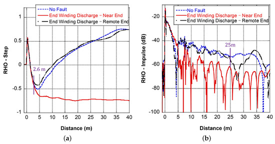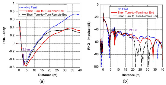 Stresses due to transient overvoltage in the supply are a factor that contributes to turn-to-turn short failure over time [36]. The first and second coil turns were shorted at 2.4 m and 7.2 m, respectively. The corresponding FDR results are shown in Figure 14. The existence of the fault can be clearly observed from both the near end and remote end measurement results. The response has an obvious drop in magnitude at the fault location, and the apparent coil length is reduced. Although the deviation in the step response trace of the remote end measurement begins at around 17 m, the trend deviation starts at 21 m, which is very close to the actual value. The impulse response shows an obvious deviation at 19.5 m.