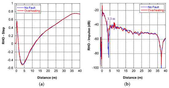 FDR results of the coil with the local overheating defect: (a) step response, (b) impulse response in logarithm scale.