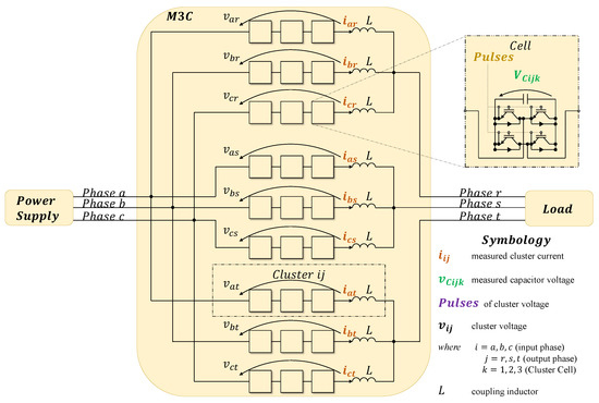 An M3C has modularity, the ability to reach high-voltage levels, power quality, bidirectional power conversion, and redundancy [27]. It has nine clusters (three per phase) that link the input phases (a, b, c) with the output phases (r, s, t), each consisting of three cells. Additionally, each cell has a full-bridge monophasic inverter. It has been widely utilized [15]; examples are injecting wind energy into an electrical network [25], in low-frequency AC transmission [28], and as a solid-state transformer for medium- and high-voltage AC substations [29].