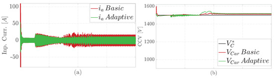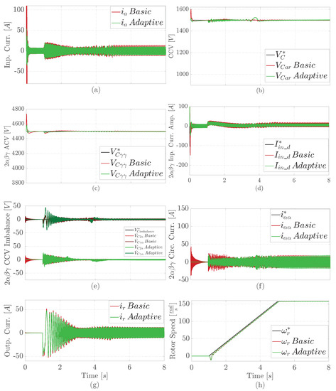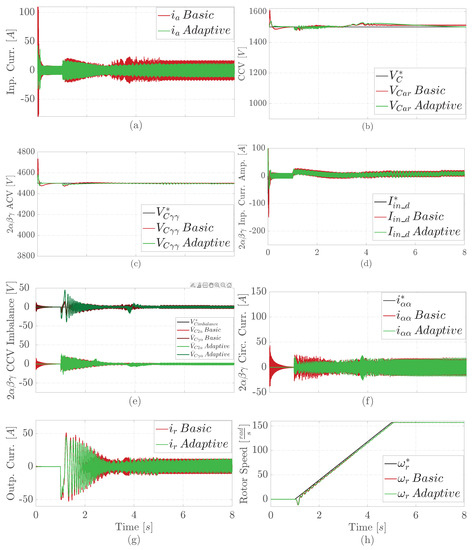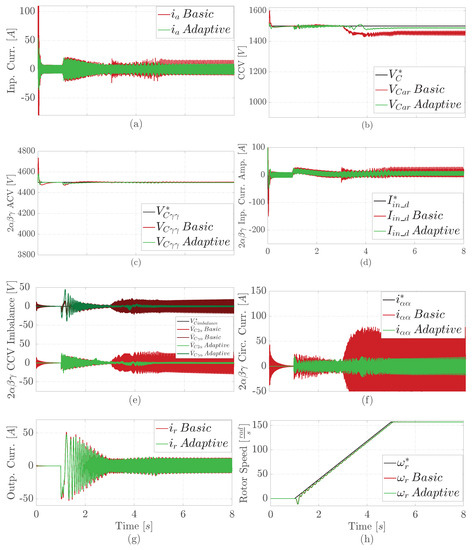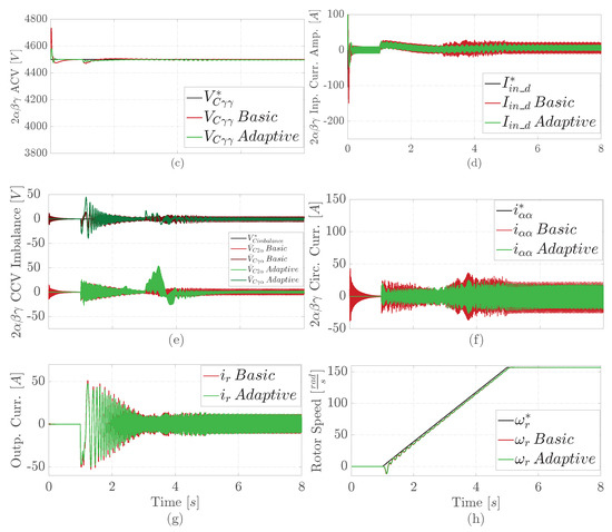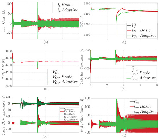 Regarding the variables in double- coordinates, a similar behavior to the one shown in Figure 3 is obtained. The adaptive solution has lower overshoots of ACV in Figure 7c, input current amplitude in Figure 7d, intra and inter CCV imbalance in Figure 7e, and circulating current in Figure 7f. After the faults, the adaptive solution completely recovers its performance, while the basic solution does not.