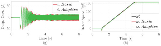 Comparative simulation results under parameters changes of the motor at 5 s (there is 0.8 times decrease in , , and ), and the pump at 7 s (there is a 1.5 times increase in both and ): (a) phase a input current, (b) branch CCV, (c) controlled ACV, (d) controlled d component of the input current amplitude in , (e) controlled intra and inter CCV imbalance in , (f) controlled component of the circulating current in , (g) phase r output current, (h) PMSM angular rotor speed.