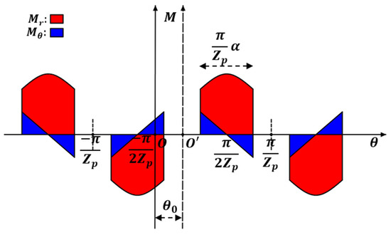 Figure 2 depicts the parallel magnetization at an arbitrary position of the rotor, denoted as . In the 2D polar coordinate system, the magnetic magnetization can be expressed as follows: