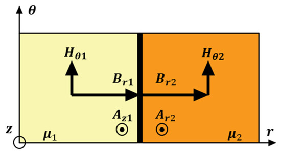 In Figure 4 without magnet excitation, the boundary condition between two adjacent materials is applied based on three principles: Hθ1 = Hθ2, Br1 = Br2, and Az1 = Az2. For mathematical convenience, it is preferable to choose the first and third principles, and rewrite them in terms of vector potential as follows: