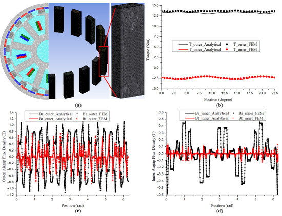 (a) A 2D model for magnetic attraction force analysis (33,450 mesh elements) and a 3D model for stress/deformation analysis (632,268 mesh elements); (b) the electromagnetic torque in the outer air gap and inner air gap; the air gap flux density in the (c) outer air gap and (d) inner air gap.