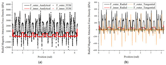 (a) The radial magnetic attraction force density; (b) the radial and tangential magnetic force density in the outer and inner air gap.