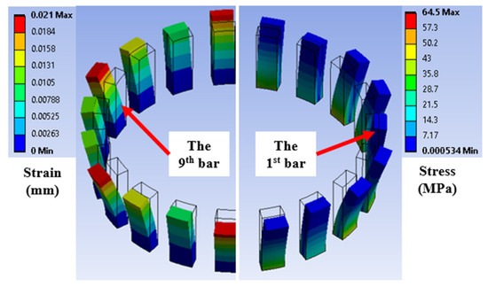 Figure 9 shows non-uniform deformation as well as stress in bars. The first bar has almost no significant influence from the magnetic force, whereas an extreme bend is occupied in the ninth bar.